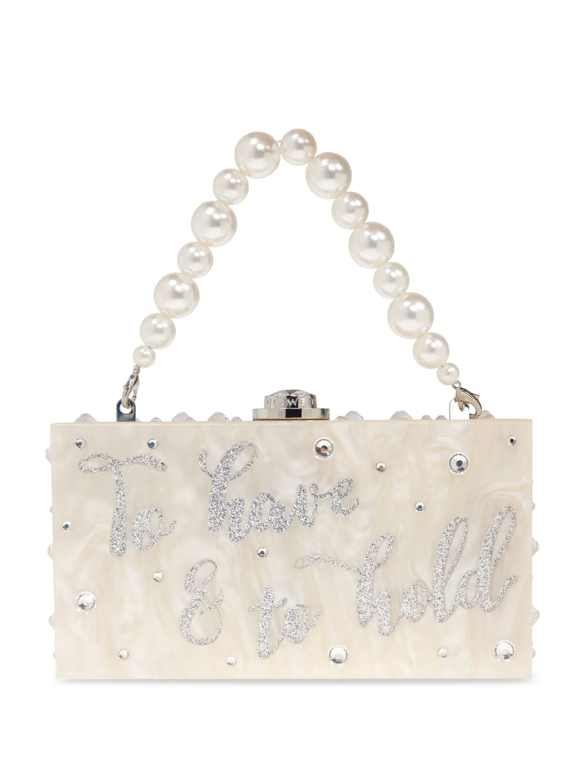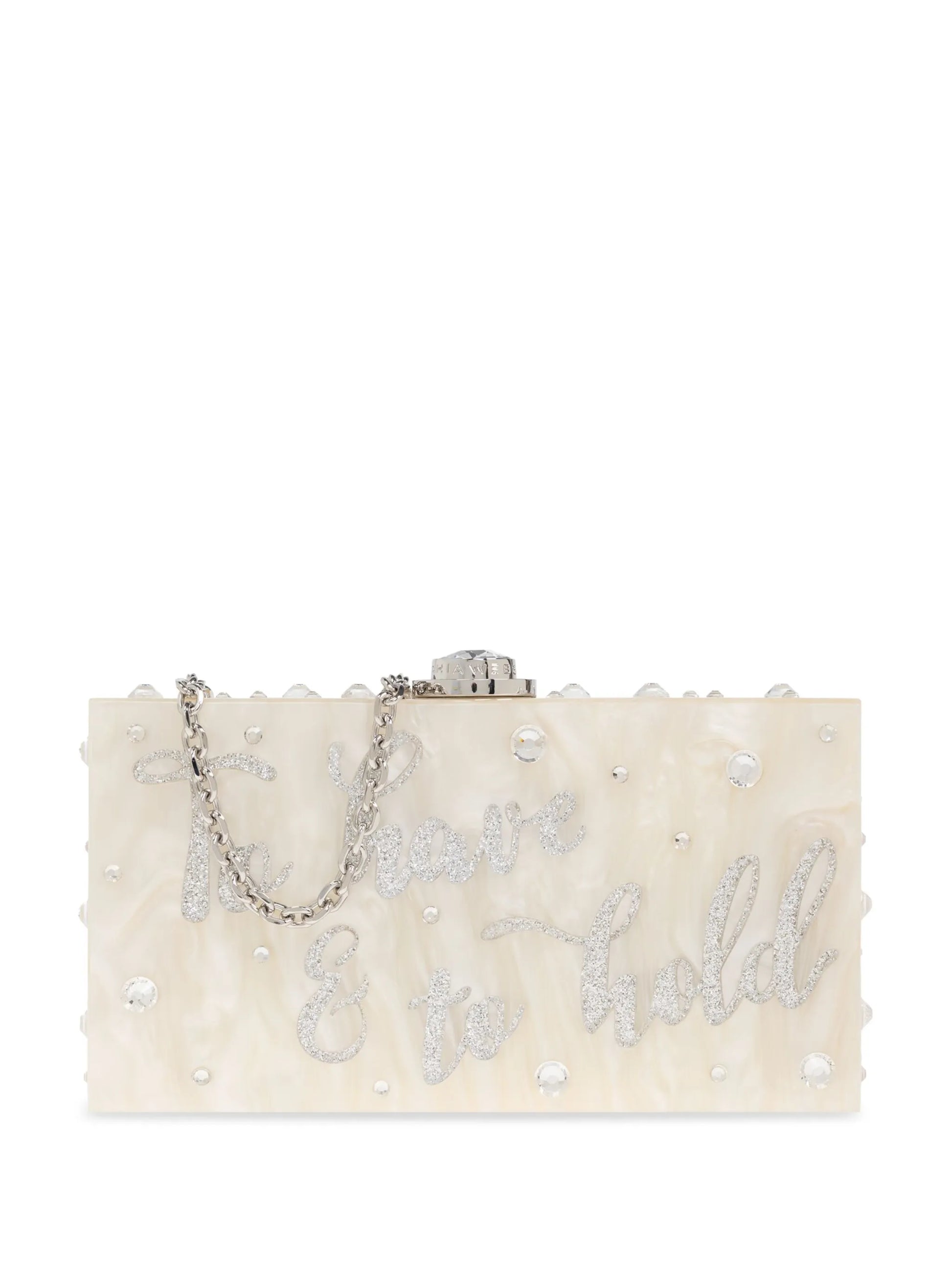 Introducing the "Cleo" clutch bag, a creation by the renowned designer Sophia Webster, whose work is revolutionizing the fashion world. This exceptional handbag stands out with its rectangular shape and is crafted from material that imitates mother of pearl, giving it a unique shine. A unique clutch for your hen party or wedding day.
